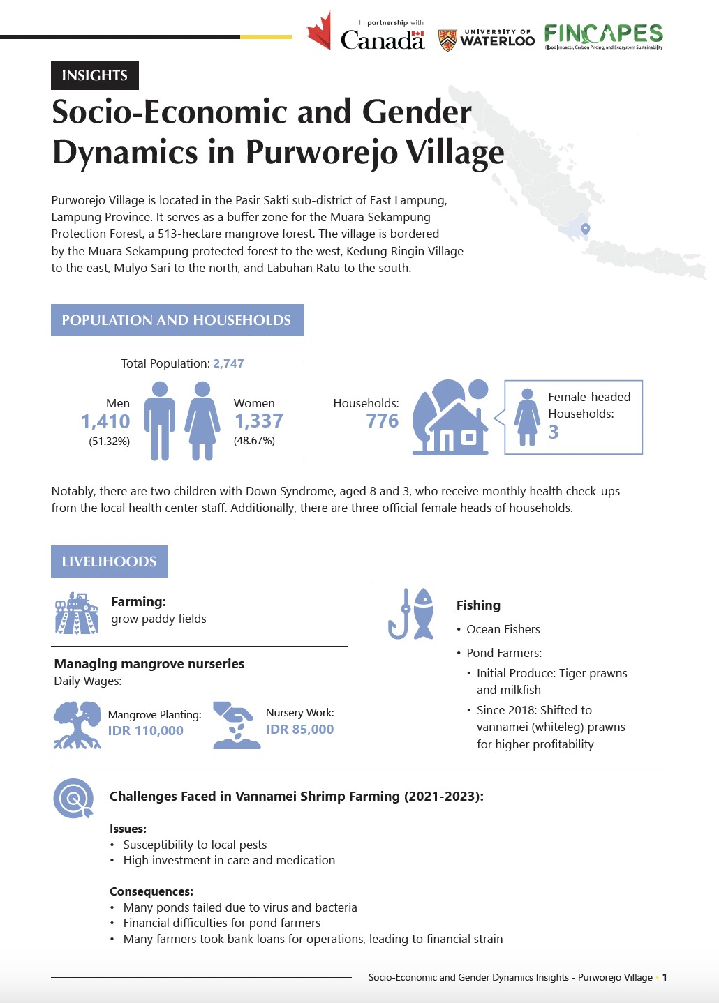 This publication delves into the socio-economic and gender dynamics of Purworejo Village, offering a comprehensive examination of the local landscape. It explores the village's geography, the primary livelihoods of its residents, and the structure of its social organization. By analyzing these elements, the publication provides insights into the interplay between socio-economic factors and gender roles within the community. It highlights how these dynamics shape everyday life in Purworejo Village, contributing to a deeper understanding of its social fabric and economic activities.